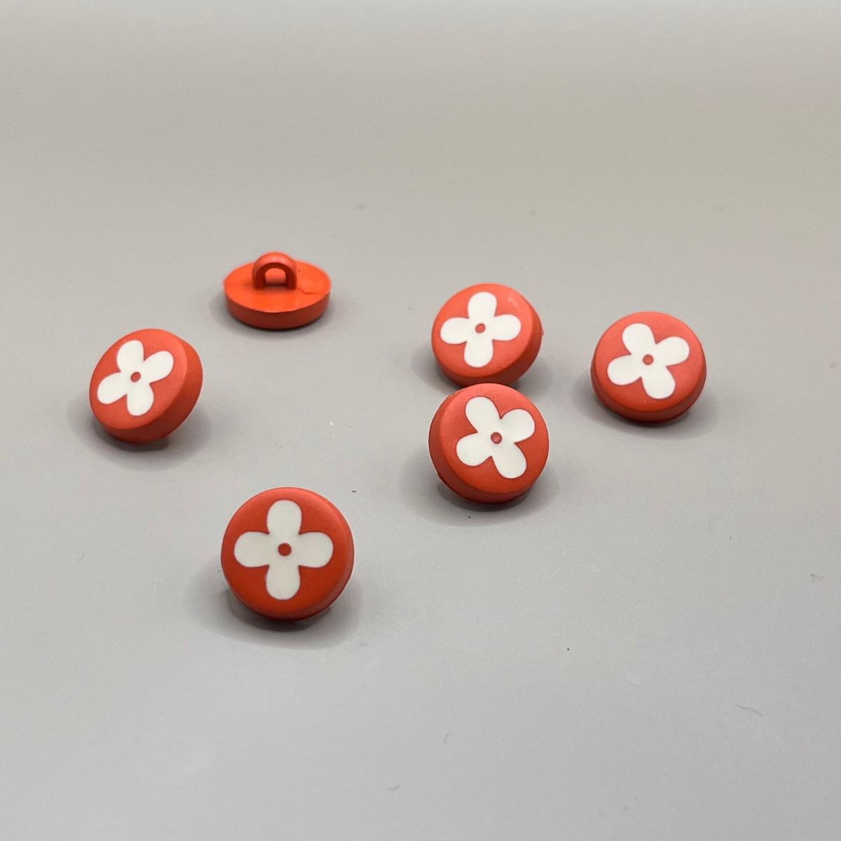 Cute orange with off-white flowers corozo button. Made in Europe and tested to EU standards. Size 12mm.