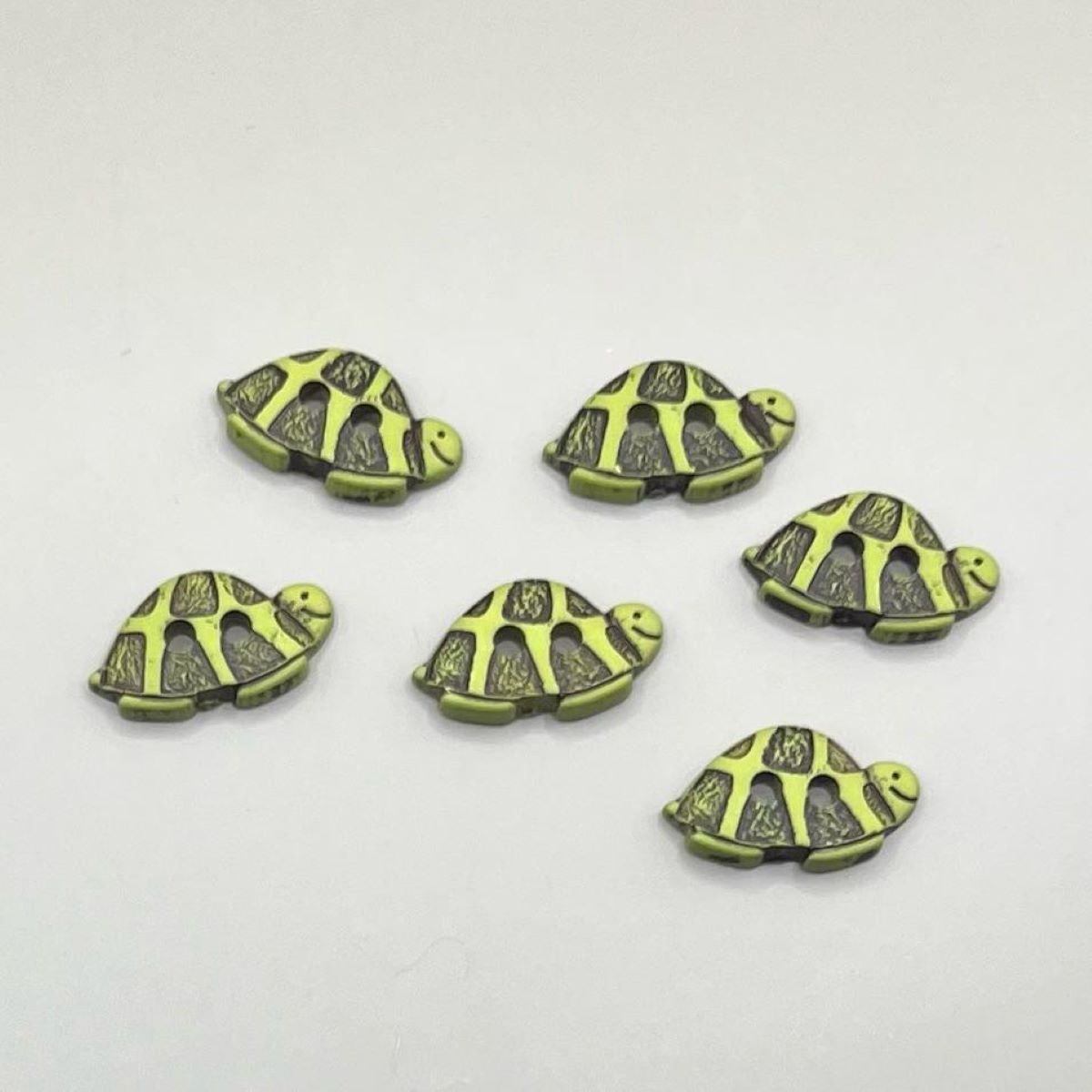 Green tortoise-shaped buttons, perfect for children's clothing. Made in Europe and tested to EU standards. Size 15mm.