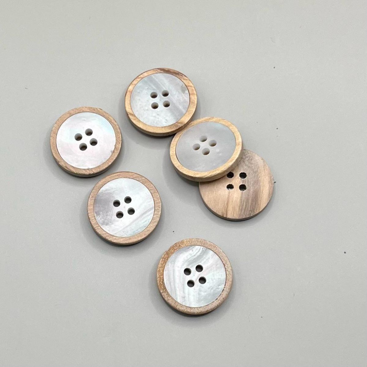 Gorgeous pale wood button with a pearly poly insert. Size 15mm. Made in Europe and tested to EU standards. Take care when washing.