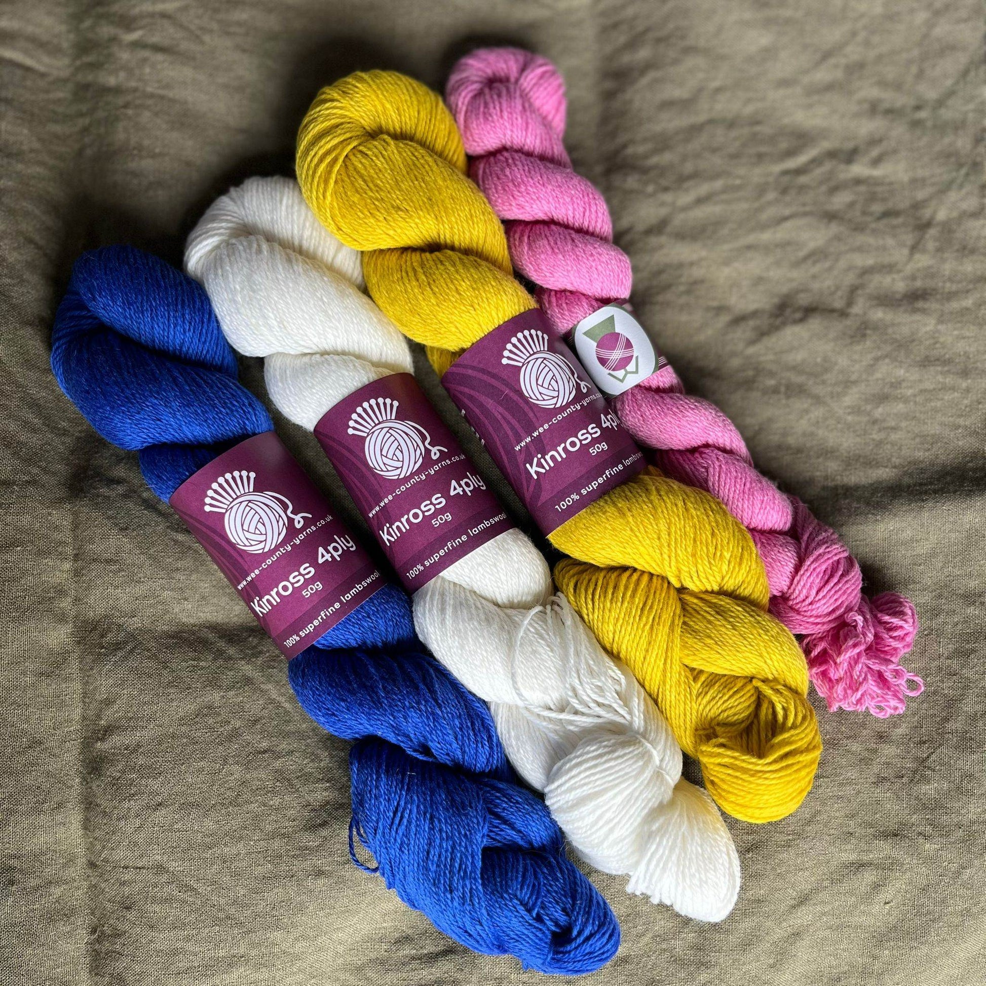 4 x skeins of yarn (3x 50g Saltire, Gorse and Snowdrop 1x 20g Posy), pdf pattern (sent direct from Ravelry) and a 5ml sachet of Eucalan Wool Wash to block your beautiful cowl.