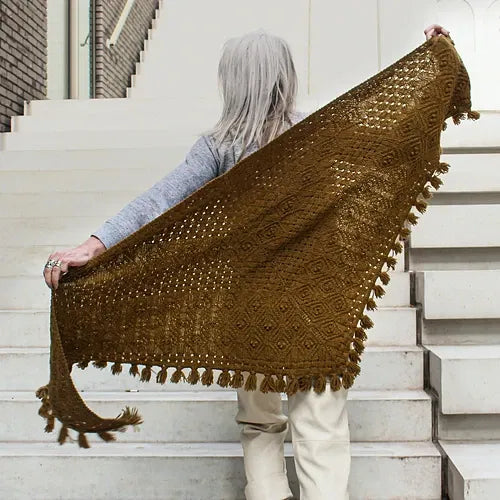The Corbis Shawl flows organically from rhythmic basketweave sections into tactile diamond shapes, creating a dynamic interplay of pattern and form. Playful tassels adorning the border echo the diamond motifs, adding graceful movement and visual interest to this beautifully versatile wrap that transitions effortlessly from casual to elegant occasions.