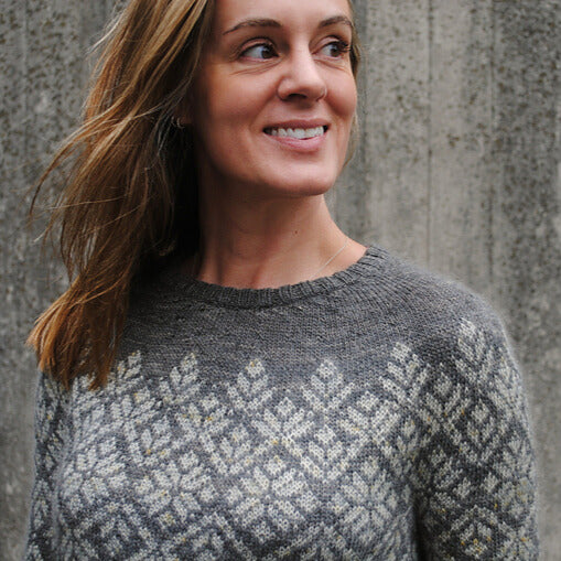 This garment is worked top-down, in the round. After the neckband, short row shaping is incorporated to optimise fit. The majority of the yoke features a stranded colourwork pattern. Once the yoke is completed, stitches are separated into body and sleeves, which are each worked separately and in the round. The stranded colourwork pattern is worked into the upper body and sleeves, after which each are worked in stockinette to the waistband and cuffs. Before working the cuffs, a small section of stranded colourwork is added to each sleeve.